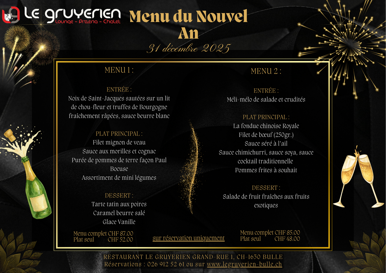 Pour célébrer le passage à la nouvelle année, Le Gruyérien vous invite à une soirée gourmande et chaleureuse autour de menus spécialement préparés pour l’occasion. Laissez-vous porter par les saveurs authentiques de notre terroir cuisiné avec passion pour un réveillon inoubliable.